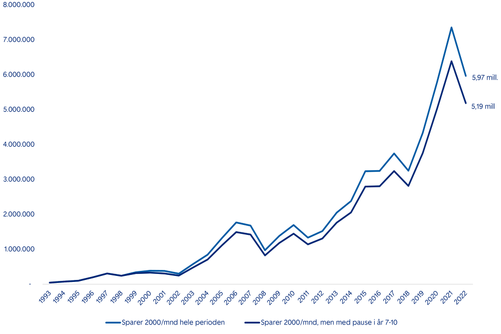 – Selv om det kanskje oppleves enkelt å sette sparingen på pause ett år eller tre, må du huske at dette får store konsekvenser for sluttresultatet ditt. Den reelle effekten kan bli mange ganger større enn beløpet du dropper å spare, sier Nikpour.