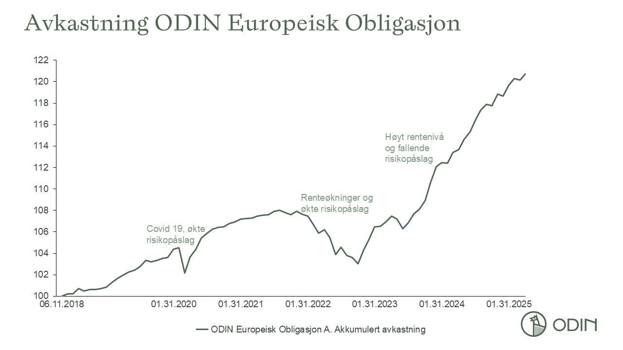 Usikkerhet rundt handelskrig og svakere økonomiske utsikter slo ut i økte risikopåslag i kredittmarkedet i begynnelsen av april, da USA annonserte konkrete tollsatser på import fra en rekke land. Nå er påslagene praktisk talt tilbake der de var før «Liberation Day». Forvalteren tar høyde for at risikopåslagene kan stige noe igjen, hvilket har innvirkning på fondets investeringsstrategi.