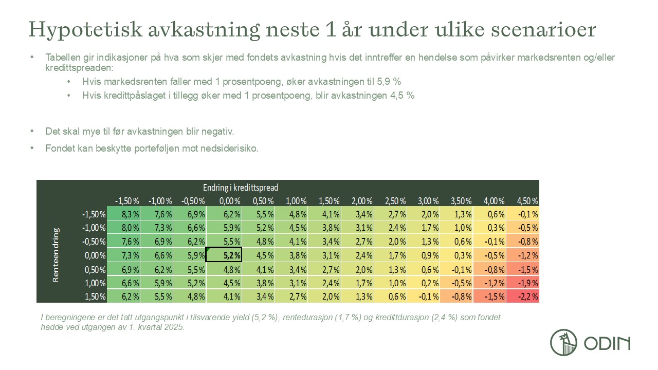 For ODIN Europeisk Obligasjon vil avkastningen i et scenario med fallende markedsrenter bli høyere enn dagens yieldnivå tilsier, gitt at ikke kredittmarginene samtidig stiger vesentlig.