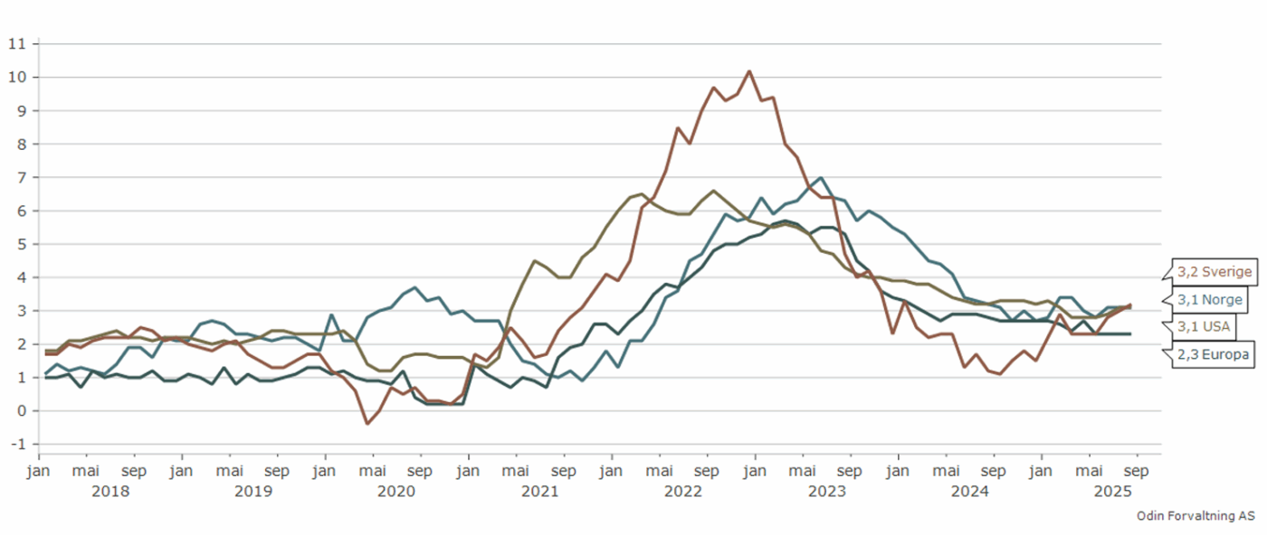 Til tross for at september har et dårlig rykte på seg, steg børsene denne måneden også. Nok en gang var oppgangen størst i amerikanske IT selskaper. Nasdaq steg med over 5 prosent. De asiatiske børsene var også veldig sterke i september, mens oppgangen i Europa ikke var like kraftig. Optimismen er høy i markedet nå, og rentekutt fra sentralbanken i USA gjorde ikke optimismen noe mindre. I tillegg signaliserte Federal Reserve at det mest sannsynlig kommer 5-6 ytterligere rentekutt fremover. Da er det lett å glemme at årsaken til kuttene skyldes tydelige svakheter i arbeidsmarkedet og stigende ledighet. For børsene er «glasset halvfullt» og man gleder seg over rentekutt uten å være nevneverdig bekymret for enkelte svakhetstegn i økonomien. Norges Bank kuttet også rentene denne måneden, men i motsetning til den amerikanske sentralbanken blir det nok mer beskjedne rentekutt fra Norges Bank sin side fremover. Selv om inflasjonen har kommet ned, er den fortsatt høyere enn det Norges Bank ønsker seg. Banken ser for seg et rentekutt i året de neste 3 årene.