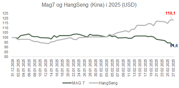 Det har vært en måned med store svingninger på børsene, men de fleste markedene har fortsatt å stige. I februar var det først og fremst de europeiske og kinesiske markedene som steg. I USA har utviklingen vært langt svakere i det siste, spesielt blant IT aksjer. Den IT-tunge Nasdaq indeksen falt med over 5 prosent i februar, mens det har vært oppgang i de fleste europeiske markeder og i Kina.   Markedet har endret seg på noen måneder, der vinnerne fra i fjor er taperne i år og vice versa. Det var en «Trump-effekt» i markedet før jul og i januar. Da steg amerikanske aksjer som kanskje ville ha glede av et proteksjonistisk tollregime, mens rentene steg på grunn av frykt for høyere inflasjon. Nå ser det ut til at markedet ser litt annerledes på dette. Europeiske aksjer stiger mer enn amerikanske, og kinesiske IT aksjer stiger langt mer enn de amerikanske. Det siste er nok en konsekvens av Deepseek og det sjokket man fikk når kineserne var i stand til å lage gode AI-løsninger uavhengig av amerikansk teknologi. Flere kinesiske IT selskaper, som Alibaba, har steget med over 40 prosent denne måneden. Dette er i sterk kontrast til selskaper som Alphabet og Amazon som har falt med 11-13 prosent i løpet av måneden. Nå skal det også sies at europeiske aksjer og kinesiske IT aksjer er langt billigere priset enn de amerikanske.