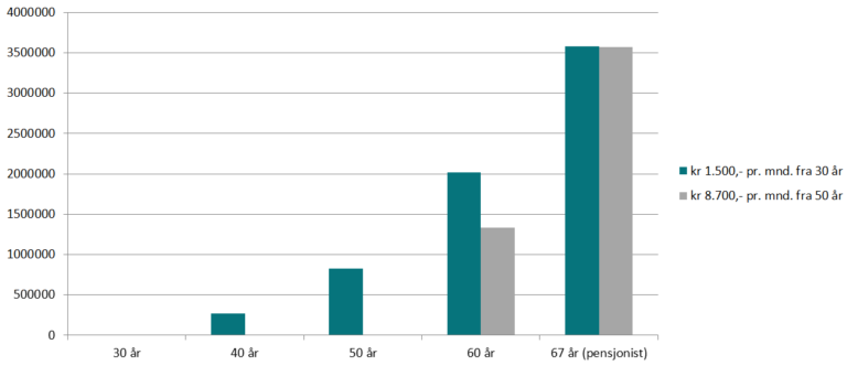 En tur innom den lokale banken som 50-åring blir en vekker. Han tar grep, og begynner å spare kr 8.700,- i aksjefond hver måned til han går av med pensjon, som 67-åring.