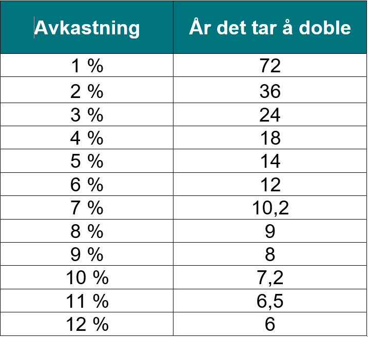 Vi kan illustrere “The rule of 72” med tall, som i tabellen nedenfor, og for enkelhets skyld er inflasjonen holdt utenfor: