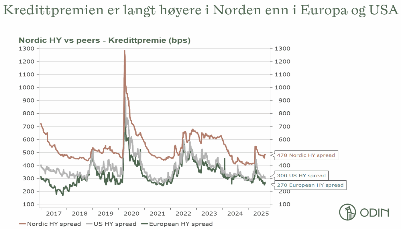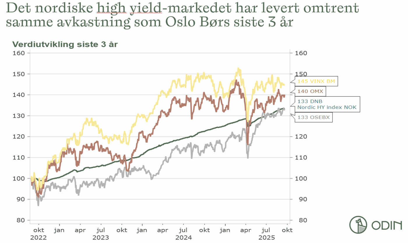 Det nordiske markedet for høyrenteobligasjoner har levert høy risikojustert avkastning de siste årene. Både i 2023 og 2024 steg markedet med over 10 prosent, og trenden har fortsatt i år, kun avbrutt av et lite fall etter tollnyheter fra USA i april. Norsk og utenlandsk kapital strømmer inn i markedet, som over tid har hatt høyere kredittpåslag enn høyrentemarkedene i USA og Europa.