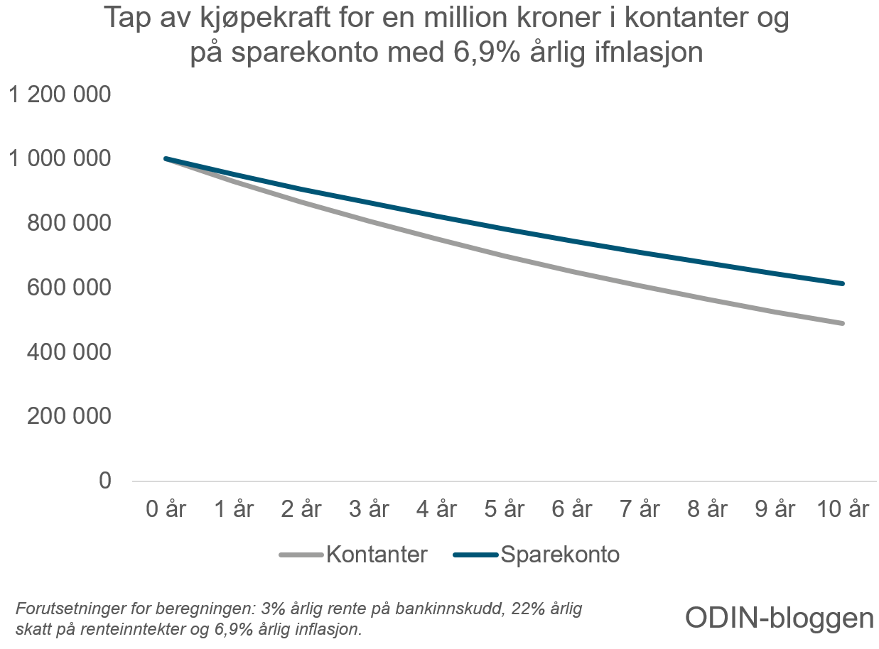 • En million kroner i kontanter vil miste halvparten av kjøpekraften i løpet av ti år med 6,9 prosent årlig inflasjon.
